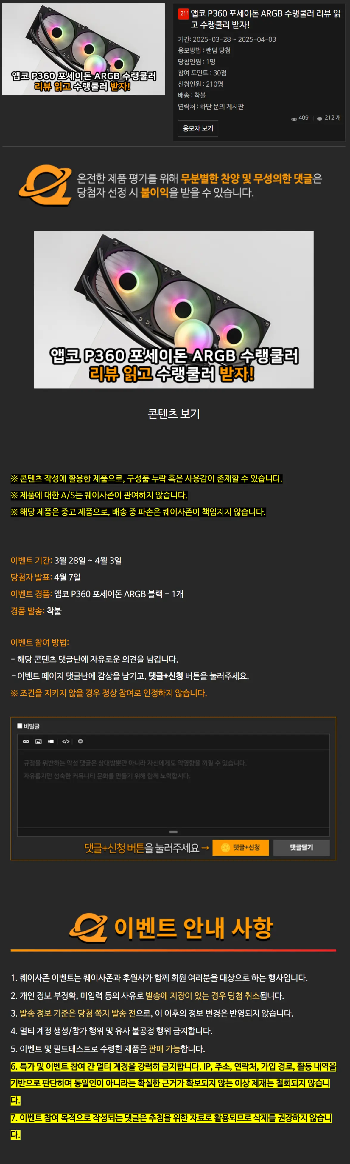 [퀘이사존] 앱코 P360 포세이돈 ARGB 수랭쿨러 리뷰 읽고 수랭쿨러 받자!