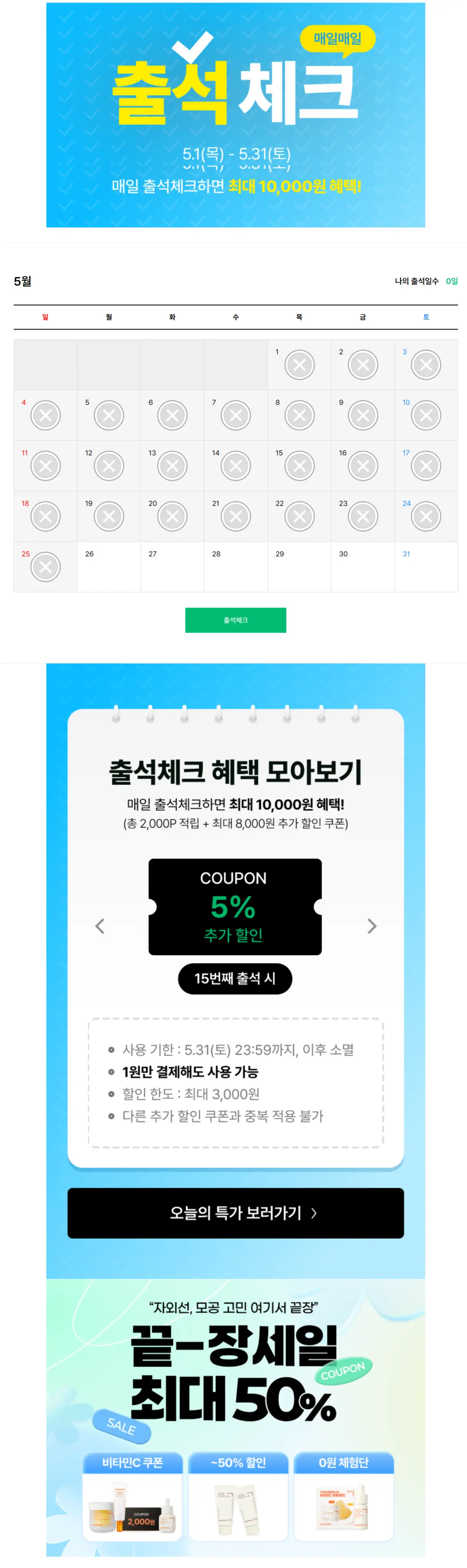 - 출석 15일차 : 5% 추가할인쿠폰 (최대 할인한도 3천원)