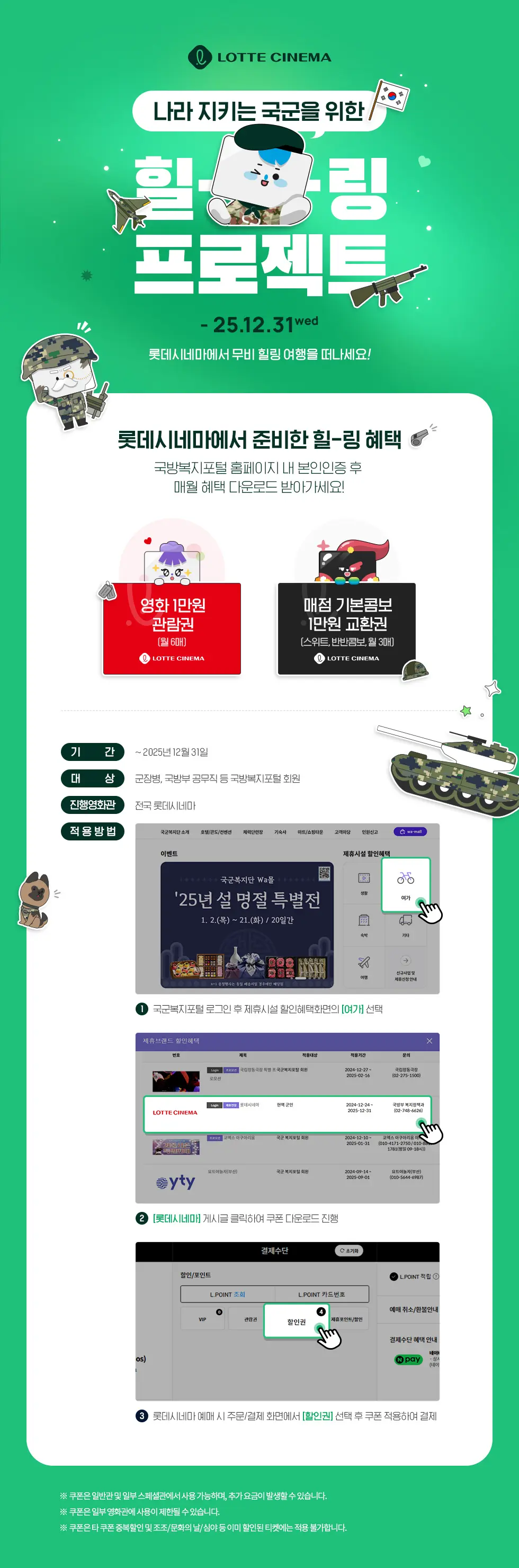 ※국군복지포털 회원에 한 해 제휴 게시글 확인 가능하며, 롯데시네마 회원에 한 해 쿠폰 다운로드 가능합니다.