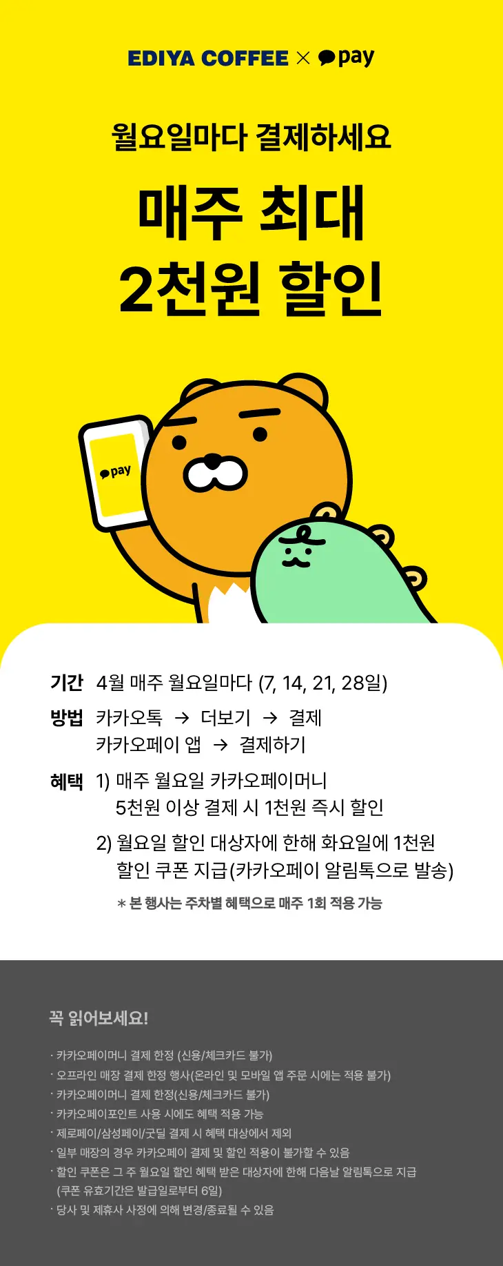 [이디야 커피] 월요일 마다 결제 하세요. 매주 최대 2천원 할인