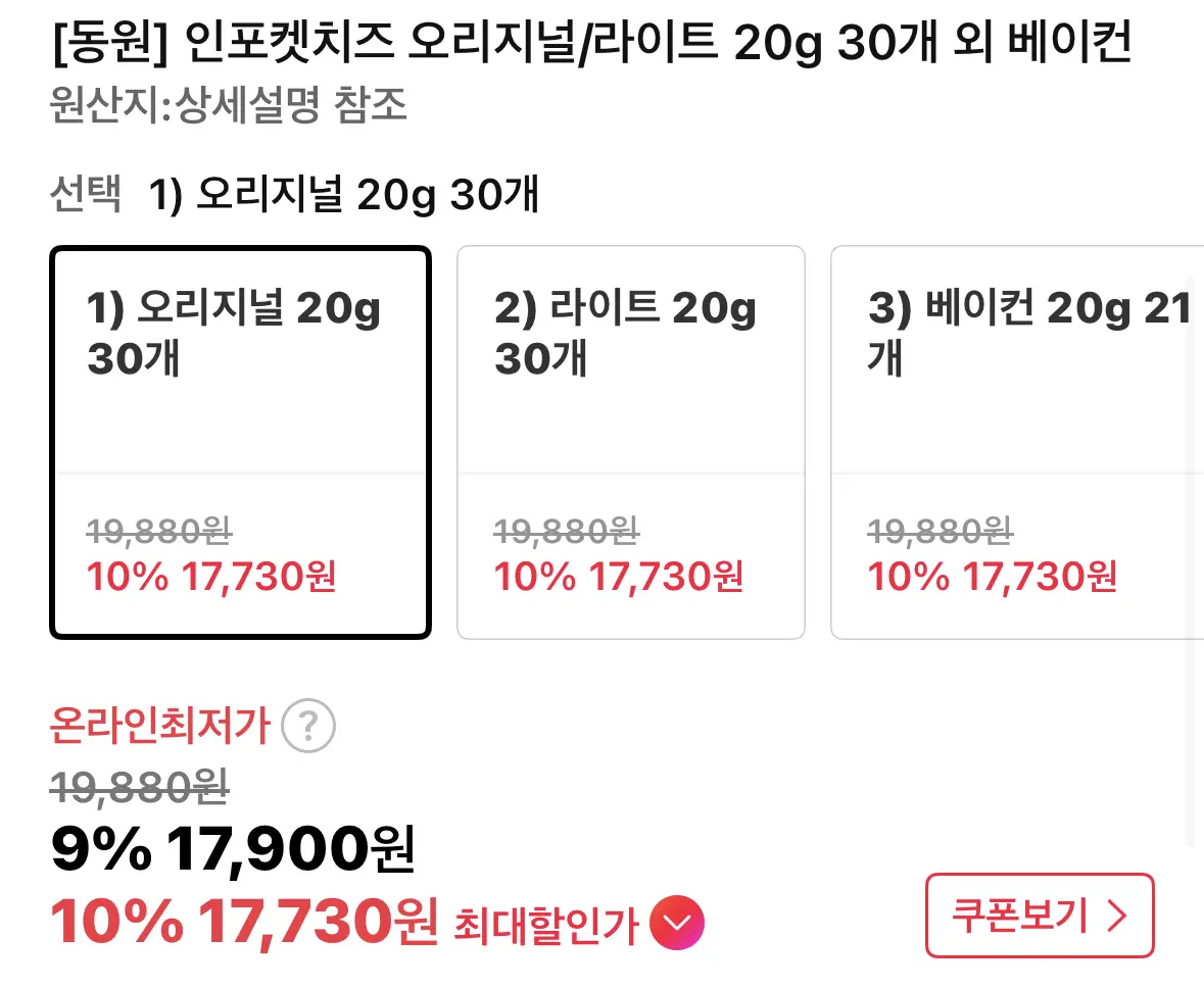 맛은 오리지널/라이트/베이컨 요렇게 3가지 구성으로 되어있네요